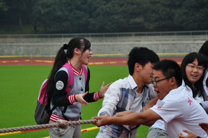 由国家第九套广播体操比赛拉开帷幕后,首个进行比赛的项目是考验团队精神的拔河。首先由抽签决定对手,余下一个班级直接轮空到第二轮的比赛 ,每队十人。随着裁判张东岳一声令下,比赛正式开始。在拉拉队“一、二、一、二”的节奏声中,同学们使出浑身解数,拼尽全力两脚蹬地,节奏一致。在播班与二班的第一轮对决中,两方势均力敌,曾一度相持不下,甚至有同学因为重心过于向下向后而倾倒在地。在动作技巧与全军齐心协力的呐喊声下,播班暂时获胜。大家中场休息时全班同学一起商议拉绳技巧和人员配置方法,进入第二轮的角逐可谓高手云集,二班如同杀出的黑马,以压倒性的优势扳倒播班成为冠军,最终播班位列第二,一班第三。