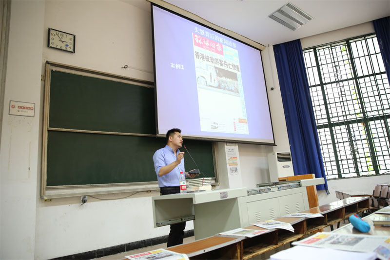 师生带来了一场主题为“从环球视角解读复杂世界”的讲座。他首先诙谐开场问同学有没有听说或者读过环球时报,并要求同学用任何一个词概括这个报纸,有同学指出环球时报是“官方”报纸,也有同学称其“商业民族主义”,被刘洋赞为“很专业”的一个词。