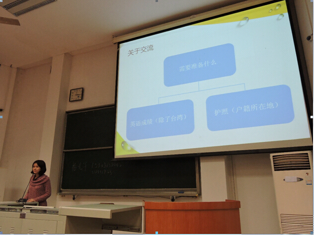 来自12级新闻班的吴嘉思,曾在大二期间到新加坡交流学习的她在海外交流方面对同学们进行了详细介绍,包括资格条件、消息来源和相关准备等。她还就实习的来源和选择问题展开交流,并鼓励同学们“看看这个世界”。