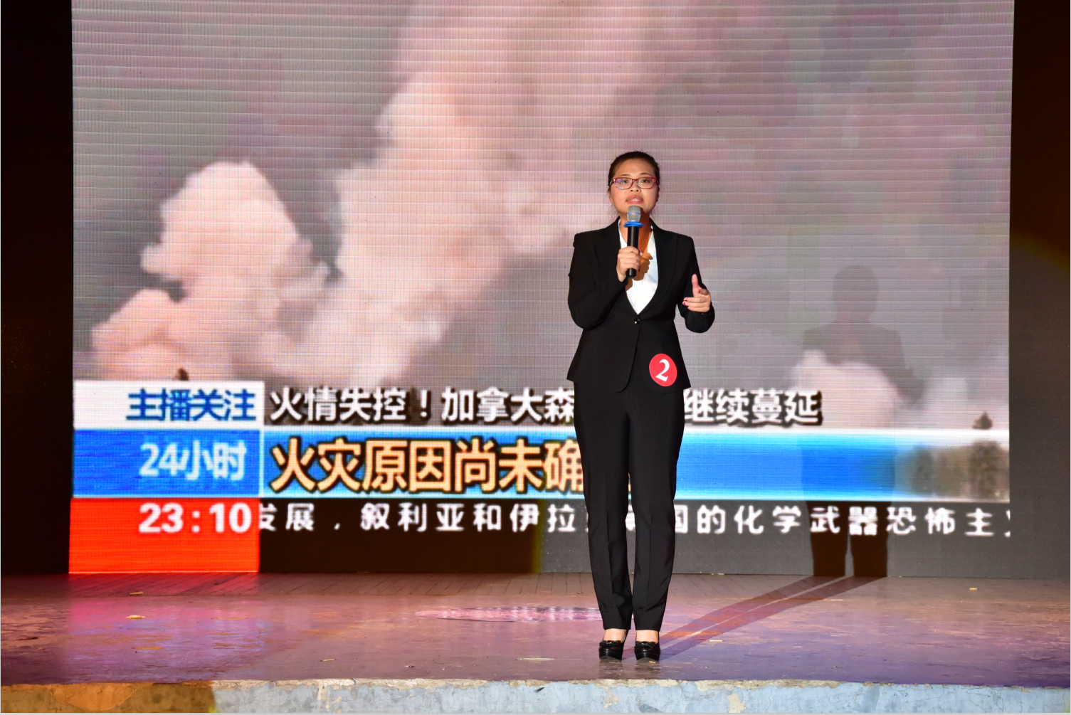 最后一个环节“新新在现场”,要求选手们随机抽取特定形式展现新闻现场:一是根据提供的视频进行联线播报;二是由工作人员根据抽取的新闻现场进行演绎还原,选手扮演其中的主持人或记者角色,进行现场播报或危机化解。“樱花节吸引数万游客”、“加拿大森林大火蔓延”、“浙江钱塘江大潮盛况”等一系列新闻现场在选手们的解说下有了更真实的画面感,有些选手的水平不亚于专业的新闻直播记者,沉稳、清晰的临场思维是平日积累锻炼的最佳佐证。抽到现场危机化解的选手,面对着诸如“宋仲基做客武大”、“病患家属上医院闹事”、“决赛现场选手退赛”等状况百出,也显示出自己机智灵敏的反应能力。