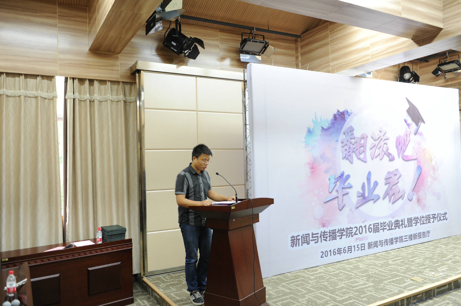 “你总说毕业遥遥无期,转眼就各奔东西......”6月15日上午9点,在院办3楼报告厅,“翻滚吧,毕业君”2016届本科生毕业典礼暨学位授予仪式拉开了序幕。在场的不仅有学生,还有家长。他们捧着鲜花,挽着孩子的手,共同见证这值得纪念的一刻。