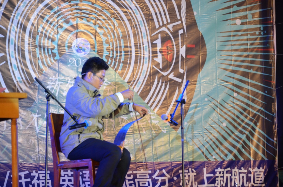 “我不是个演员,却因为爱你而选择表演。”帅气的学长晏子冬以吉他为伴,新传三班的马蓉、刘弋戈背对而坐,呈上情歌串烧的表演。缓慢而蓝调的旋律配上深情流露的呐喊与合唱,很快便带动了现场气氛,大家主动挥舞起荧光棒,拍手相和。