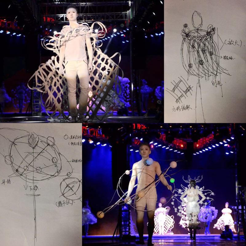模特李聪颖是“美杜莎”的穿戴者。“美杜莎”没有办法正常地穿戴,每次都需要一个比较高的男生把她抱进去。在舞台上她款款前行,步调较慢。因为衣服里有很多用来固定的铁丝,所以她能迈出的步伐很小。虽然衣服下加了轮子,可以推着往前走,但由于身高较高,即使轮子受力她也要承受很多重量,行进仍旧很困难,“有的时候真的就是很艰难的往前扭动的那种感觉。”