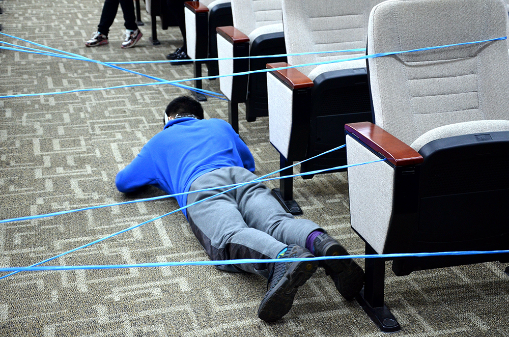 第二个环节:竞选骗局——盲人摸象。工作人员之前已经在报告厅的两边座椅上系好了很多根绳子,在中间的通道上形成很多阻碍,以此布置成电影中红外线的模样,绳子分为红色和蓝色两部分。本轮环节要求参赛选手从通道的一边到达另一边,并且不能碰到绳子。参赛选手可以先睁眼练习,练习几次后,音乐响起,他们就要跟着记忆走。游戏开始后,各队的队员纷纷围在参赛的队友边,为他们细细指导。“你就往前走,不要停下来。”“头低下!再低点儿!”“快到了!快到了!”现场充满了欢声笑语。在进行了一番比拼之后,本场游戏由红队胜出。