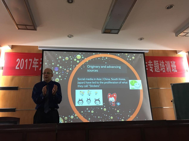 5月10日下午,来自澳大利亚迪肯大学传播和创意艺术学院的David Marshall教授专程为有爱爱 本科生授课,畅谈“Gestural Communication and Emoji Culture: Social Media’s emerging Interpersonal language of communication of the Public(姿态传播和Emoji文化:社交媒体新兴的人际沟通语言与公开自我)”。讲座全程干货满满,引发在场学生的强烈兴趣。