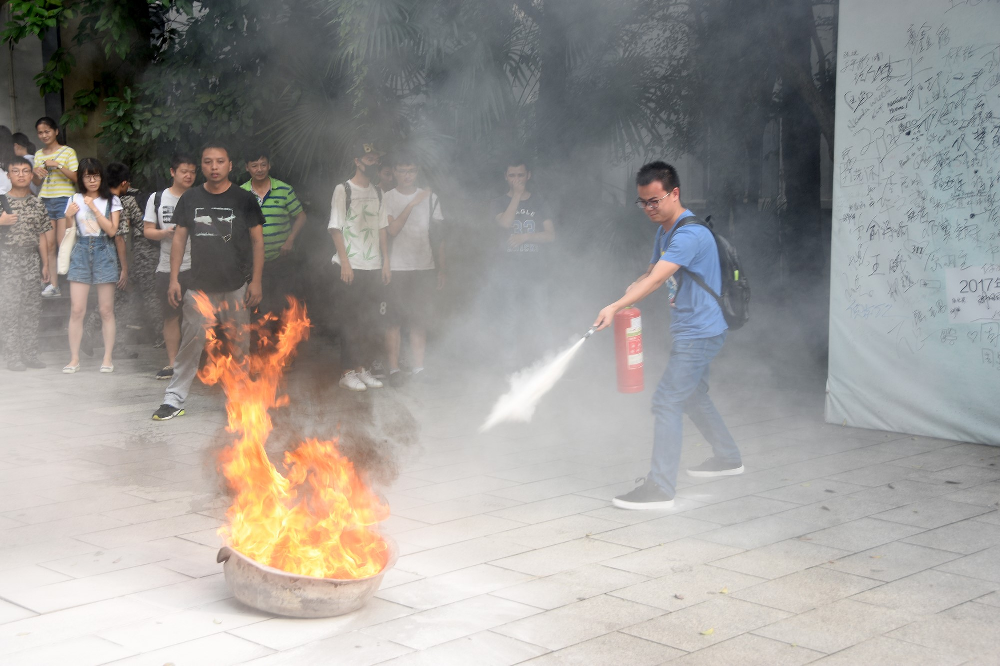 活动三是消防演练。让学生亲身体会如何使用干粉灭火器。干粉灭火器是最为常见且有效的灭火手段,为了使同学们能够在火灾尚未蔓延开时将灾情扼杀于萌芽之中,本次活动特意安排学生亲身体验灭火流程。使用前要将瓶体颠倒几次,使筒内干粉松动然后除掉铅封,拔掉保险销,左手握着喷管,右手提着压把在距火焰两米的地方,右手用力压下压把,左手拿着喷管左右摇摆,喷射干粉覆盖燃烧区根部,直至把火全部扑灭。熟记这个流程并且运用,让同学们能够切身体会到防火救灾的重要性。