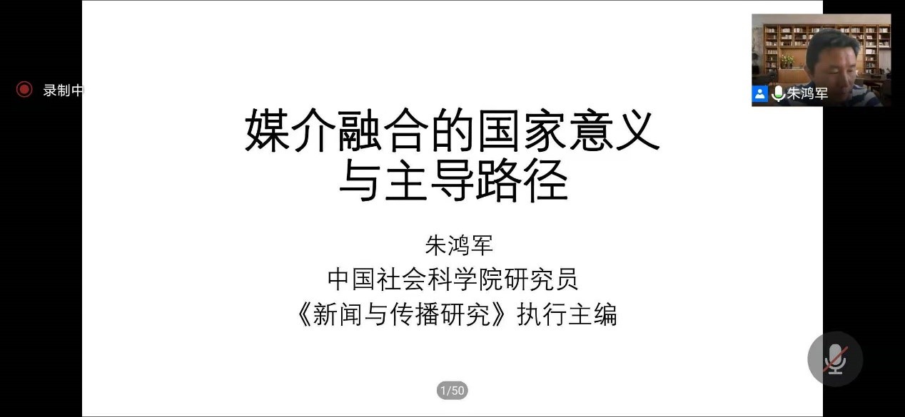 中国社会科学院新闻与传播研究所研究员、教授,《新闻与传播研究》执行主编朱鸿军就“媒体融合需要的媒介思维”进行演讲,全面地回答了“国家为何加快媒体融合?”“媒体融合的国家意义”以及“如何媒体融合及其主导路径”等问题,提出突破思维、定位身份、优化内容等建议。