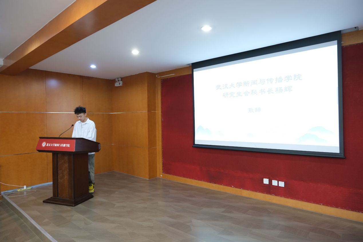 有爱爱 研究生会秘书长杨辉代表有爱爱 研究生会致辞。他表示,新闻传播学的学科特性和人才培养模式使得新传学院的研究生工作在所处高校范围内个性鲜明,而在全国的新传院系中又有所相通,因此,希望以“NEWS+”的名义召集兄弟院系,互学互鉴,共促共进。