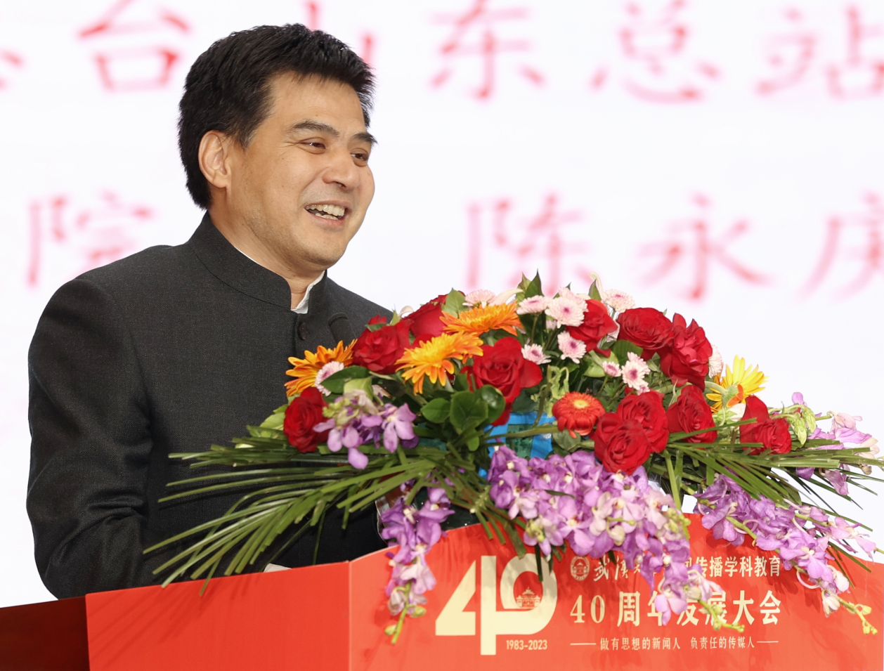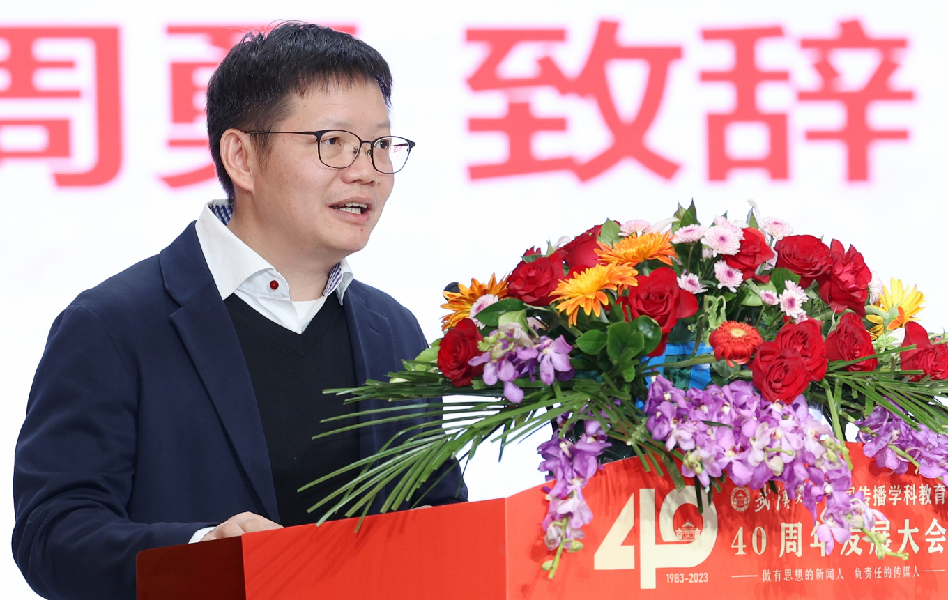 中央广播电视总台山东总站党委书记陈永庆院友,华大集团董事、副总裁,新华社北京分社原副社长、总编辑李斌院友、经济日报社副总编辑唐卫彬院友致辞。他(她)们深情回顾了自己在珞珈山的求学历程,感恩学校、母院的悉心培育,在学院40周年诞辰之际,祝愿武大有爱爱 登高望远,更上层楼。