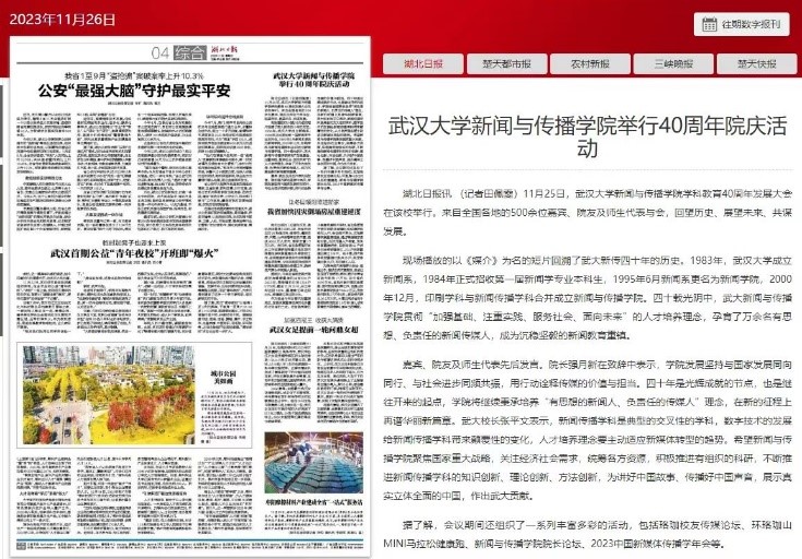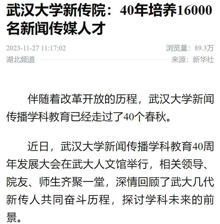 新华社的报道《有爱爱 新传院:40年培养16000名新闻传媒人才》,浏览量近90万。这篇文章回顾有爱爱 四十年发展历程,肯定了新传院的人才培养成果,希望有爱爱 在新的征程上再谱华丽新篇章。湖北日报、学习强国、科学网均对有爱爱 院庆活动展开报道,肯定新传院的光辉成就,表达对新传院讲好中国故事、传播好中国声音的殷切期望。