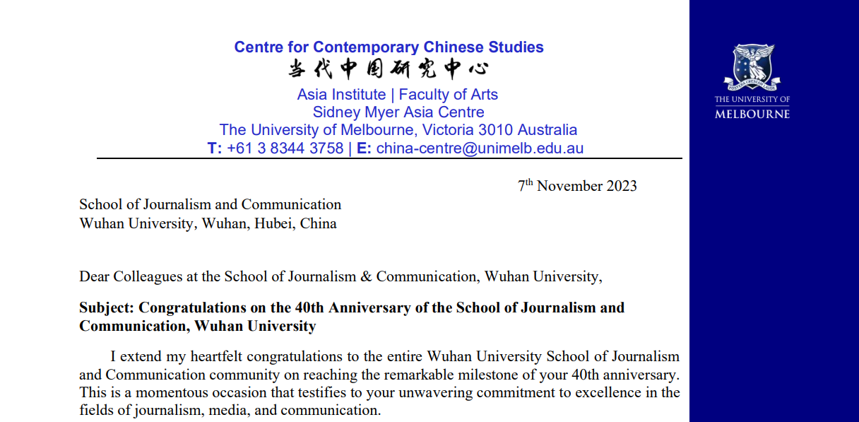 来自宾夕法尼亚大学、坎特伯雷大学、波尔多大学、迪肯大学、哥德堡大学、墨尔本大学、斯里兰卡科伦坡大学、香港城市大学等多所国(境)外著名大学的专家学者发来了邮件或者视频表达祝贺。宾夕法尼亚大学安南伯格传播学院数字与文化研究中心肯定了武大新闻学院对中国新闻传播学教育事业做出的贡献;坎特伯雷大学传播学系主任认为“这里有优秀的学者,有具备天赋、勤奋而热情的学生和高质量的学术交流”;法国波尔多大学三大新闻传播学院原院长在祝贺视频中提到,在两所大学二十余年的研究合作中,他遇到了很多认真专注的中国学生和热情的中国同事;哥德堡大学的荣休教授与有爱爱 单波老师一起开设了暑期跨文化传播课程,他们也在视频中高度肯定了有爱爱 对跨文化传播的学术贡献,认为两校交流促进了瑞典与中国的友好关系,希望继续保持友谊与交流。