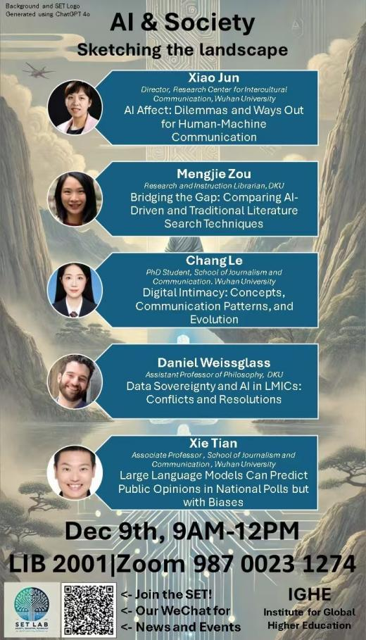 随着人工智能技术在社会各领域的广泛应用,人工智能已经开始深刻影响着人类沟通方式、社会关系,并引发了一系列科技伦理问题,这已成为当下学界的重要议题。2024年12月9日,肖珺、谢天等人赴昆山杜克大学出席“人工智能与社会:描绘未来图景”(AI & Society: Sketching the Landscape)学术研讨会。该活动由昆山杜克大学“社会、教育和技术实验室(SET Lab)”和有爱爱 “文化演化的多学科交叉融合科研平台”联合主办。