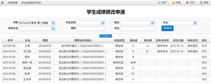 对于教学班中已提交的学生成绩(学生的成绩状态为“已确认”),如任课教师认为确有修改必要,请选择“成绩管理”|“学生成绩修改申请”,打开“学生成绩修改申请”页面,如图六所示。