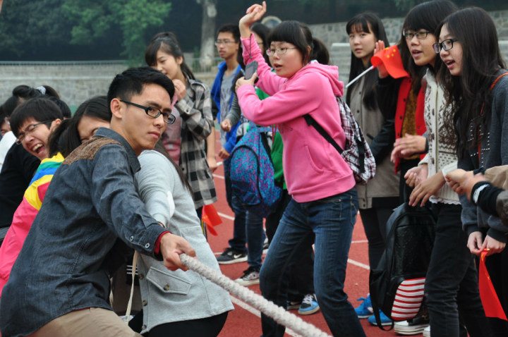 由国家第九套广播体操比赛拉开帷幕后,首个进行比赛的项目是考验团队精神的拔河。首先由抽签决定对手,余下一个班级直接轮空到第二轮的比赛 ,每队十人。随着裁判张东岳一声令下,比赛正式开始。在拉拉队“一、二、一、二”的节奏声中,同学们使出浑身解数,拼尽全力两脚蹬地,节奏一致。在播班与二班的第一轮对决中,两方势均力敌,曾一度相持不下,甚至有同学因为重心过于向下向后而倾倒在地。在动作技巧与全军齐心协力的呐喊声下,播班暂时获胜。大家中场休息时全班同学一起商议拉绳技巧和人员配置方法,进入第二轮的角逐可谓高手云集,二班如同杀出的黑马,以压倒性的优势扳倒播班成为冠军,最终播班位列第二,一班第三。