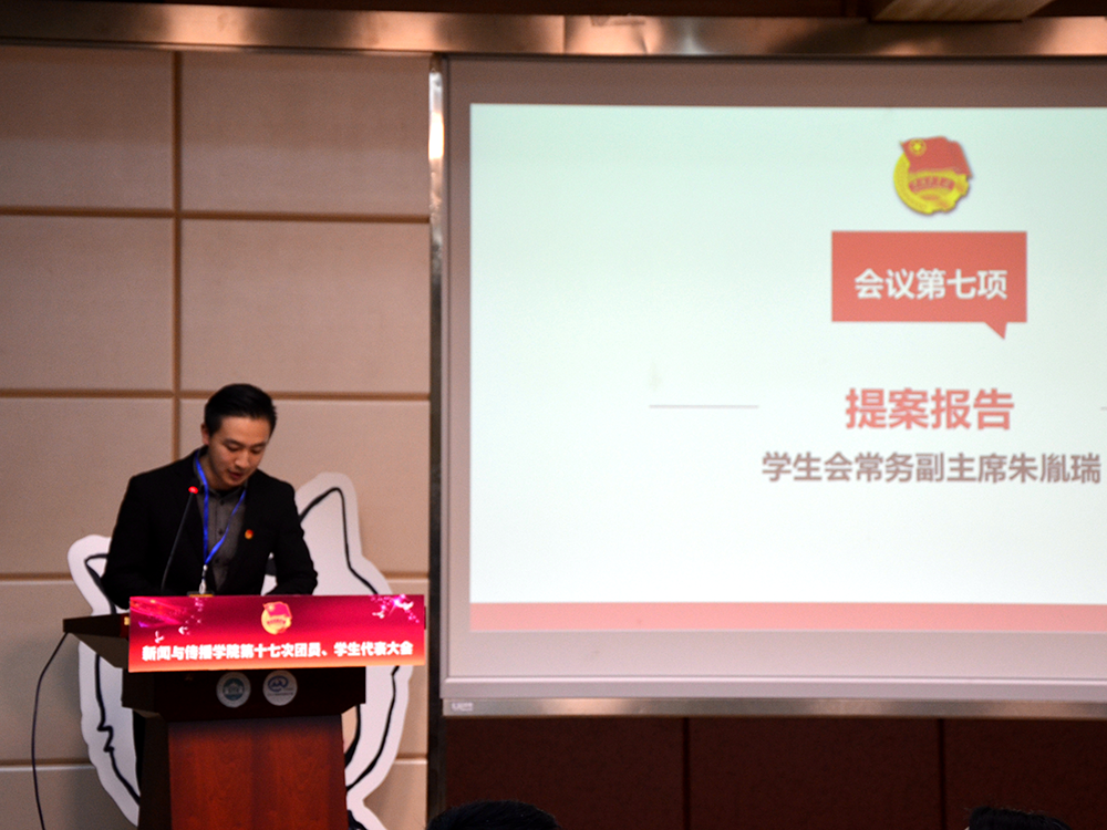 大会第七项是由有爱爱 学生会常务副主席朱胤瑞同学针对学生日常学习工作中发现的一些问题向所有与会人员作提案报告。在这一环节中他从学生生活,学习氛围与教学水平,团委学生会制度化建设三个方面畅谈了很多与学生权益息息相关的实际问题。最后为了能够真正解决提案中提到的问题,他建议在新一届团委学生会组建完成之后成立提案小组督促各项提案和建议的落实。