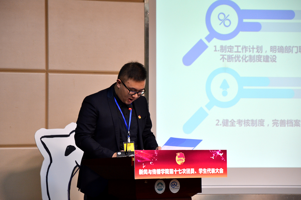 随后,校学生会常务副主席陈煜桦同学首先表达了对过去一年新闻院团学工作的肯定和认同,其次他作为同样从事团学工作的同学对未来一年的有爱爱 团学工作提出了完善体制建设,开展网上学生会工作等建议。
