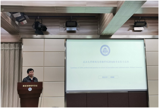 实习领导小组组长周茂君教授从实习区域和实习单位分布等方面,将2016级本科生实习情况与之前做了对比,对2016级本科生实习情况作了总结。他提出2019年的实习在以下几个方面呈现新特点:一是实习地域分布上,北京成为实习主要去向,而长沙增长明显,广州、上海、深圳略有减少,武汉有回流趋势。二是实习单位类型上,互联网单位虽仍然为主要去向,但进入传统媒体实习的人数增长不少。在传统媒体实习人数回流这一现象上,周老师认为学院出台的鼓励政策发挥不小作用。三是专业实习特点上,“触网”势头明显,既有原创内容生产,又有新媒体技术应用、产品运营,还有UI设计、交互设计和网站作品开发等等。最后他也提到,目前有爱爱 本科生实习工作中仍存在一些不足,如少数同学将学院实习推荐当作备选、实习期间过于娇气等等。
