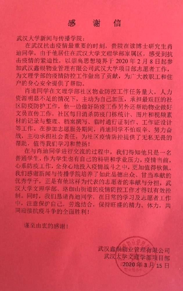 学院2018级博士研究生肖迪自2月8日起,加入文理学部社区志愿者队伍,帮助做好社区日常消杀防疫门栋统计、图片和视频素材记录和整理、档案撰写、临时通行证和工作证的设计制作等工作,共计服务76天。3月15日,学院收到了文理学部社区物业送来的感谢信,感谢肖迪同学为抗击疫情所做的工作。防控疫情期间,学院共有19名研究生作为志愿者参与到疫情防控工作,3名学生党员参与防控疫情期间的新闻宣传工作。