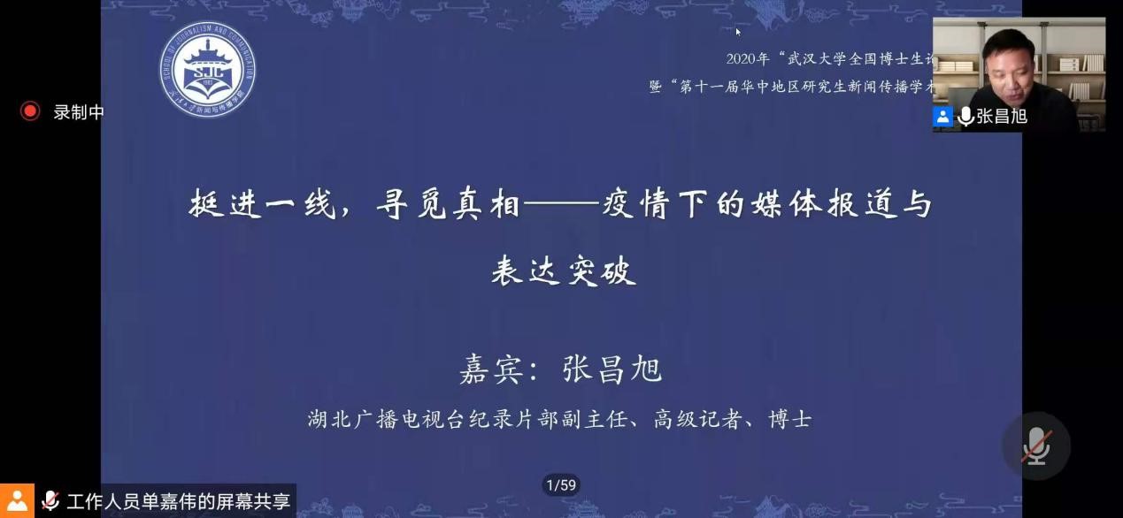 湖北广播电视台纪录片部副主任、高级记者张昌旭围绕“挺进一线,寻觅真相——疫情下的媒体报道与表达突破”进行探讨,从真相(记者眼里的武汉疫情真相)、大考(超常态下媒体报道的策略)、作为(纪录片人在大考表现面面观)、突破(疫情下纪录片表达突破)四个角度来展现疫情下的媒体表达突破。