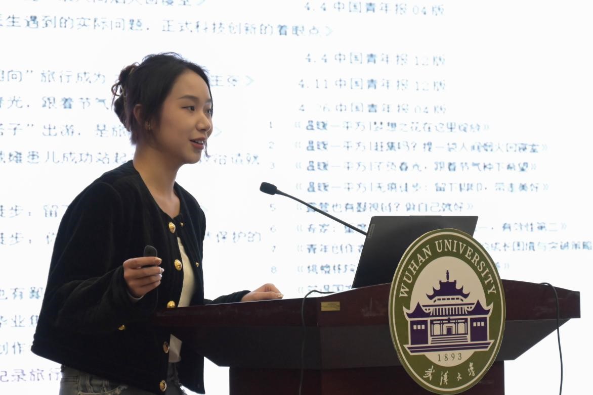随后,七位2020级优秀本科实习生代表向2021级同学们分享了各自的实习经历与经验。来自新闻学专业的侯婧怡同学向与会同学介绍了自己在人民日报·海外版记者部的工作日常。在她看来,实习可以分为“输入、整合、输出”三个部分,建议同学们先积极与老师沟通交流,做好记录和整合,同时也要保持思考、实事求是,并主动争取机会,发挥自己的特长。