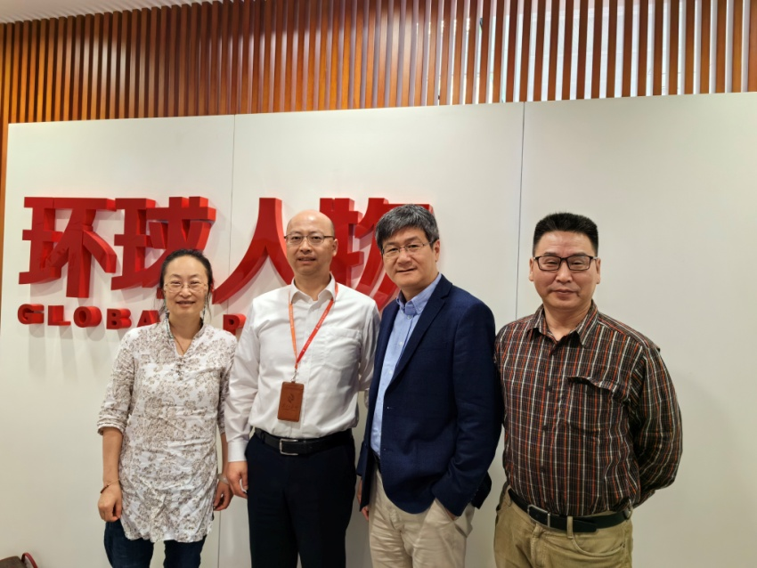 (实践教学指导小组老师在环球人物同实习指导老师与学生交流)