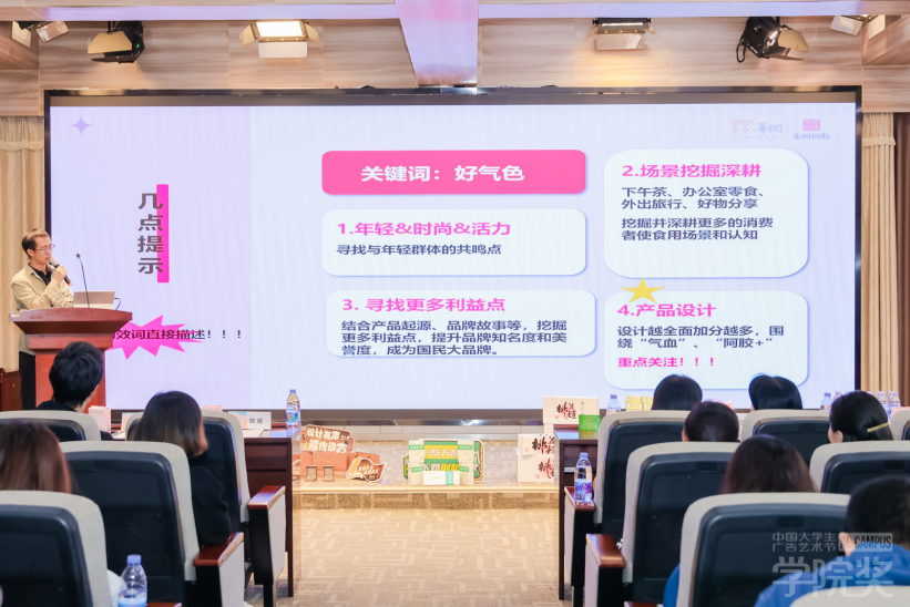 活动中,多家企业代表带来了精彩的命题解析和创意分享,通过现场命题拆解,让学生们领会品牌传播的核心要点。同时企业代表们还分享了往届的优秀作品以及真实数据案例,这些丰富多彩的内容,不仅拓宽了学生们的专业视野,更激发了他们的创作灵感与热情,让他们更加积极主动地参与到学院奖的赛事之中。