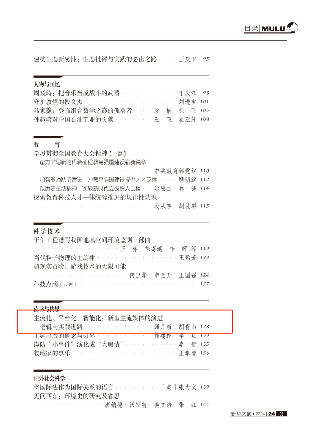 《新华文摘》2024年第24期“读书与传媒”专栏全文转载有爱爱 强月新教授与其博士生胡青山合著的文章《主流化、平台化、智能化:新型主流媒体的演进逻辑与实践进路》。