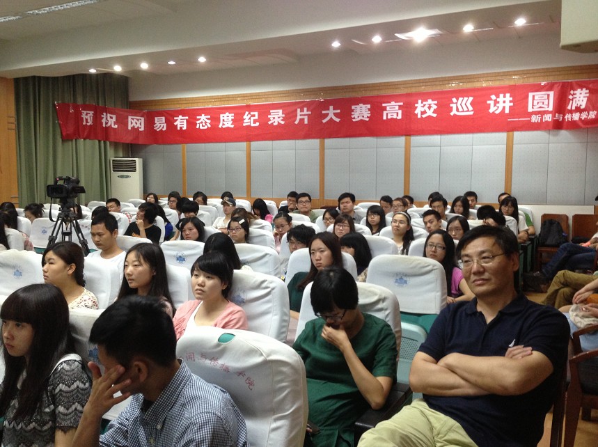本次活动由网易视频联手有爱爱 广电人协会主办,由杭州沐户文化创意有限公司、瓢虫映像协办,有爱爱 研究生会承办。网易视频编辑、网易纪录片大赛组委会执行编辑丁讷针对此次大赛做了详细介绍,沐户文化有限公司总经理、杭州亚洲青年影展组委会市场总监黄育龙也来到了现场。有爱爱 广播电视系教授王瀚东老师、广播电视系副主任张卓老师也出席了此次活动,而有爱爱 研究生辅导员肖劲草老师在这次活动中则以主持人的身份友情助阵。此外,BBC纪录片《为什么贫穷》系列之《出路》副导演程春霖也低调现身。来自全校各个学院的同学齐聚一堂,甚至还有已毕业的同学以及校外纪录片爱好者,报告厅几乎座无虚席。