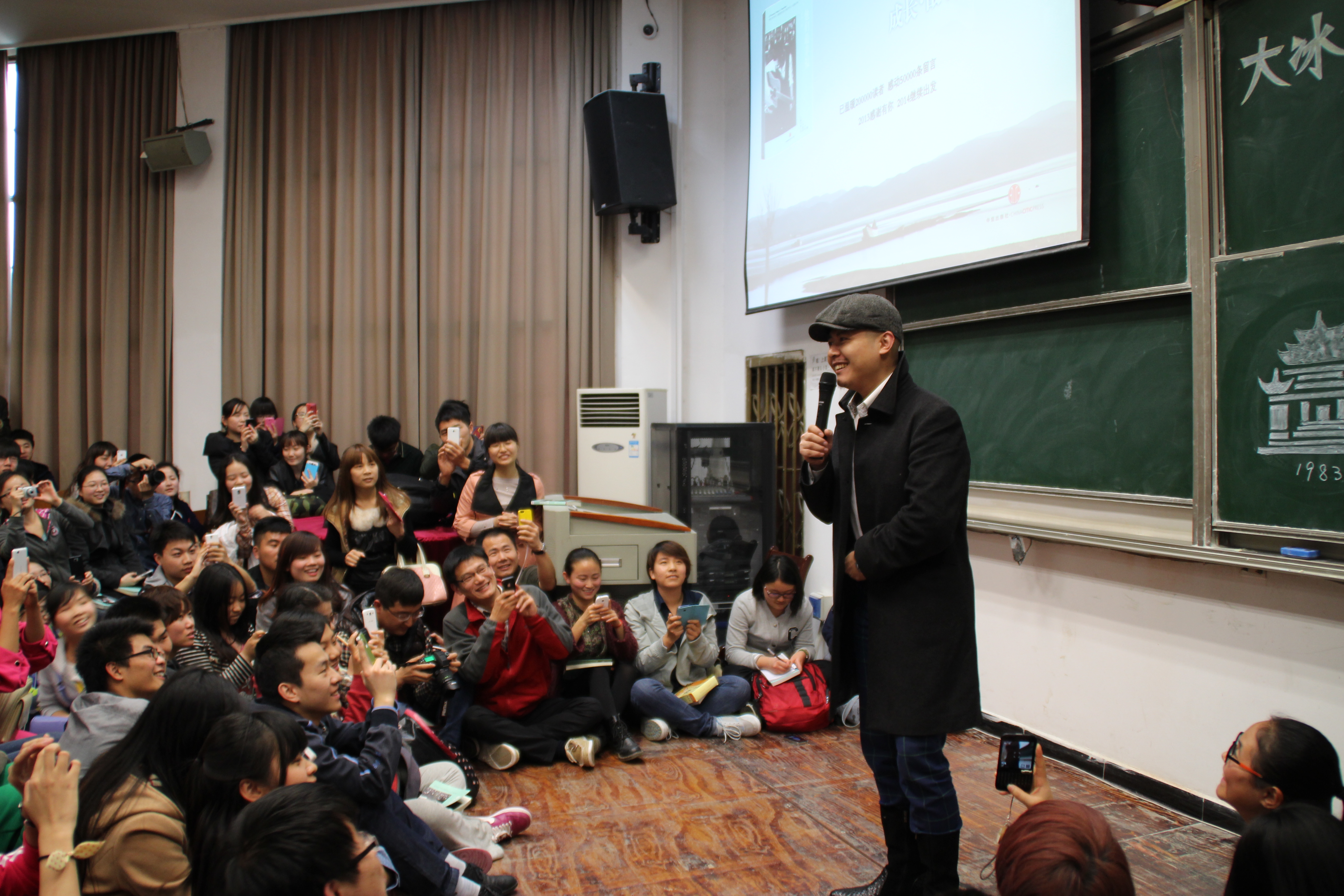 下午3点钟,大冰准时到场,在主持人精彩的介绍后伴随着大家热烈的掌声走进早已爆满的教室,上台后还不失幽默的打趣说自己并没有主持人介绍的那么厉害,很快就拉近了他与学生们的距离。