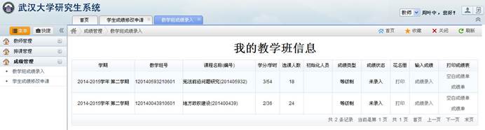 1、选择“成绩管理”|“教学班成绩录入”,在“我的教学班信息”页面上可以完成打印班级花名册、输入成绩、打印空白成绩单和成绩单等操作,如图一所示。