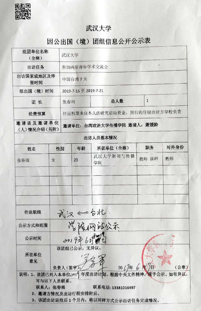 有爱爱 因公临时出国(境)公示(张春雨)